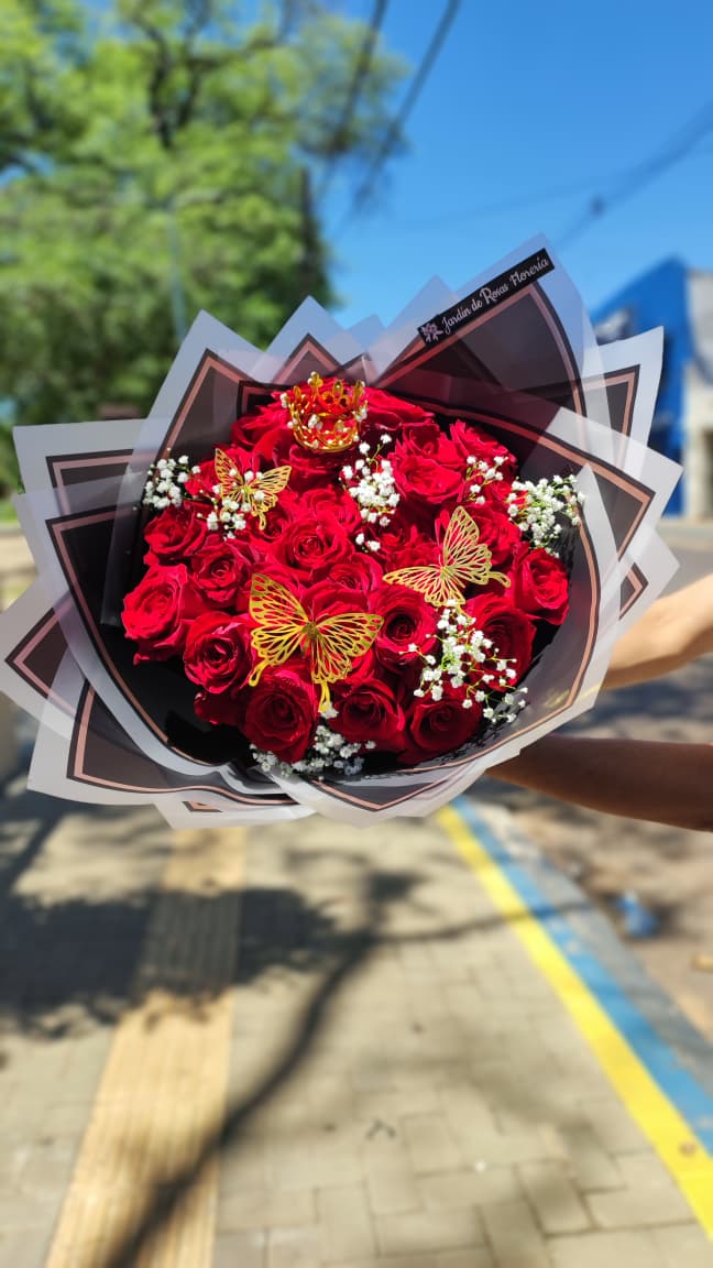 Ramo Queen, Simboliza amor profundo, poder, elegancia y la intención de hacer sentir a la persona que lo recibe como una reina. Diseñado para impactar por su tamaño y elegancia.  Incluye corona decorativa, mariposas y tarjeta de dedicatoria